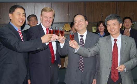 圖為中歐紡機展會巨頭在京簽署長期合作協(xié)議后舉杯慶賀