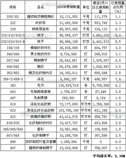 2008年1月1日至2008年12月31日,美國(guó)對(duì)從中國(guó)進(jìn)口的紡織品服裝實(shí)行新的數(shù)量限制,較2007年的限制數(shù)量,增幅從10.68%到14.71%不等,平均增幅為13.34%。