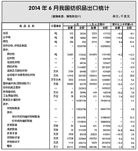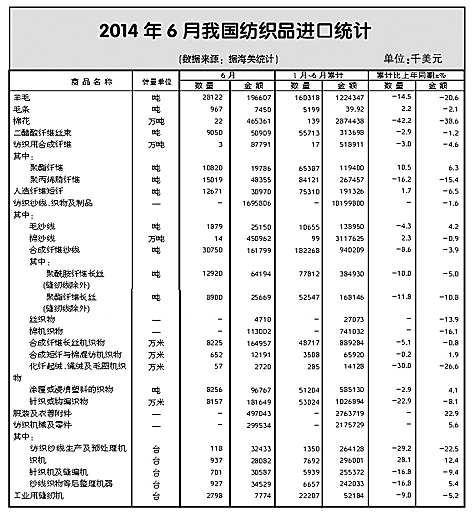 2014年以來,日本市場(chǎng)在我國(guó)出口中的地位進(jìn)一步下降,截至上半年,對(duì)日出口額占總出口額的比重不足9%。2~6月各月出口全部下降,1~6月累計(jì)下降8.4%,其中主要是服裝下降11.1%所致,紡織品保持3.6%的增長(zhǎng)。服裝中針織、梭織服裝合計(jì)出口量下降8.5%,出口單價(jià)下跌4%。