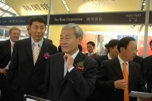 在中國貿促會紡織分會副會長富榮沛陪(左二)同下參觀博覽會