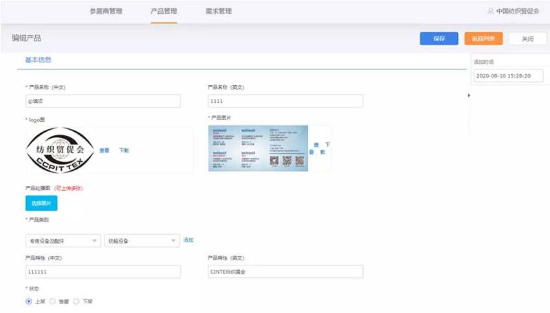 點擊“參展商管理”填寫企業(yè)信息,企業(yè)logo點擊可更換,產(chǎn)品類別、應(yīng)用領(lǐng)域、展商類別可多選、中英公司簡介、產(chǎn)品簡介,限150字,超出內(nèi)容無法顯示;