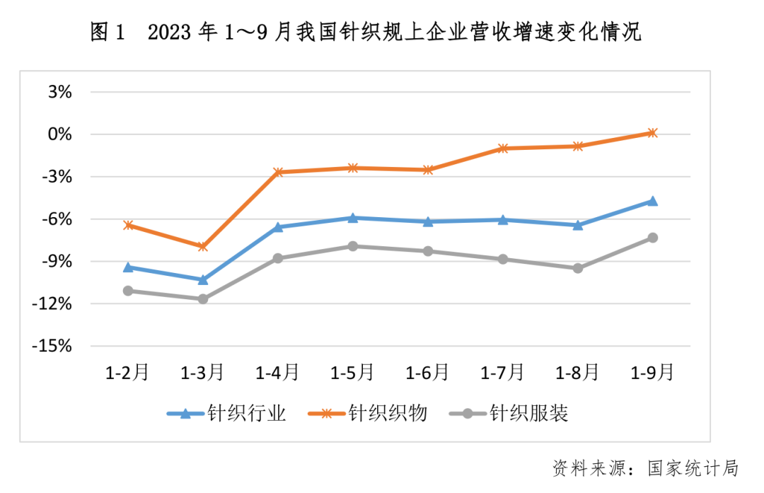 行業(yè)營收,較今年上半年略有好轉(zhuǎn)。1~9月針織行業(yè)規(guī)上企業(yè)主營業(yè)務(wù)收入同比下降4.72%,降幅較上半年收窄1.47個百分點。其中,針織織物規(guī)上企業(yè)營業(yè)收入同比微增0.11%,較上半年提高2.63個百分點;針織服裝規(guī)上企業(yè)營業(yè)收入同比下降7.33%,降幅較上半年收窄0.95個百分點。