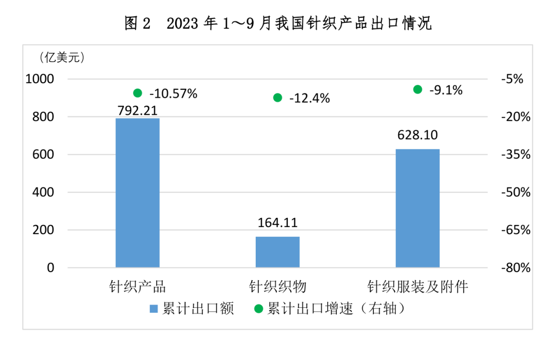 1~9月,我國針織產(chǎn)品出口792.21億美元,同比下降10.57%,降幅較上半年擴(kuò)大0.32個百分點。其中,針織織物出口164.11億美元,同比下降12.4%;針織服裝及附件出口628.10億美元,同比下降9.1%。9月當(dāng)月,我國針織產(chǎn)品出口同比下降3.54%,環(huán)比降幅大幅收窄。
