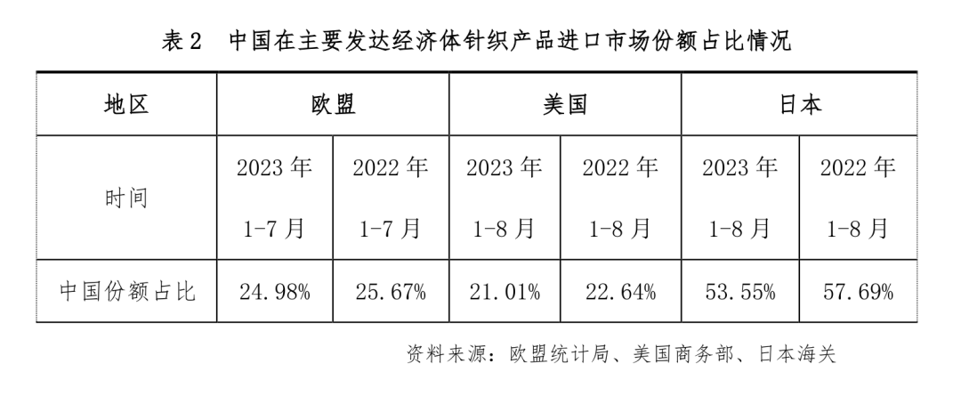 從市場份額來看,今年以來,主要發(fā)達(dá)經(jīng)濟(jì)體如美國、歐盟等對針織產(chǎn)品的進(jìn)口需求均有所下降,同時我國產(chǎn)品在上述市場中的份額占比也有所減少。1~7月歐盟針織產(chǎn)品進(jìn)口額同比下降12.55%,其中對我國進(jìn)口同比下降14.89%;1~8月美國針織產(chǎn)品進(jìn)口額同比下降27.71%, 其中對我國進(jìn)口同比下降32.93%;1~8月日本針織產(chǎn)品進(jìn)口額同比增長1.52%,其中對我國進(jìn)口同比下降4.15%。