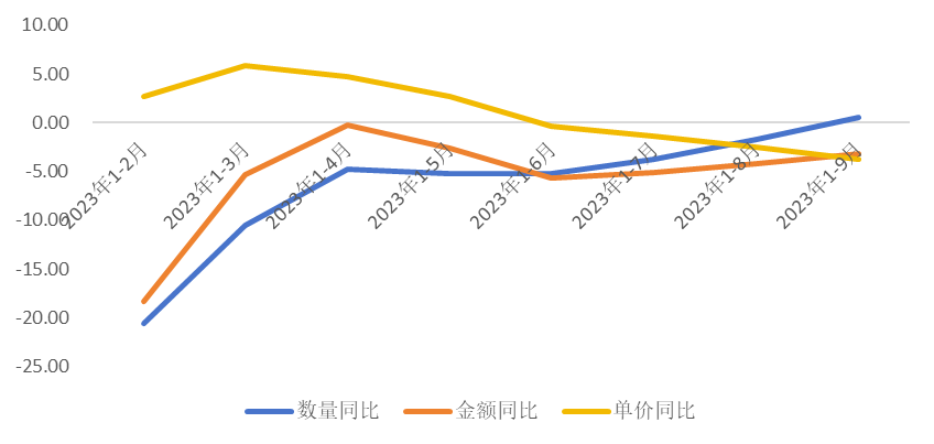 圖2. 2023年1-9月我國(guó)家用紡織品出口金額、數(shù)量、單價(jià)同比變化
