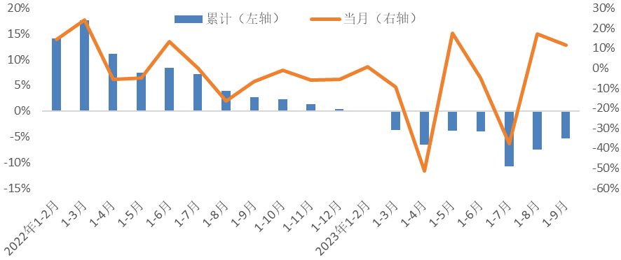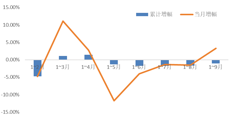 圖4.2023年1-9月家紡規(guī)模以上企業(yè)內(nèi)銷產(chǎn)值增長(zhǎng)走勢(shì)